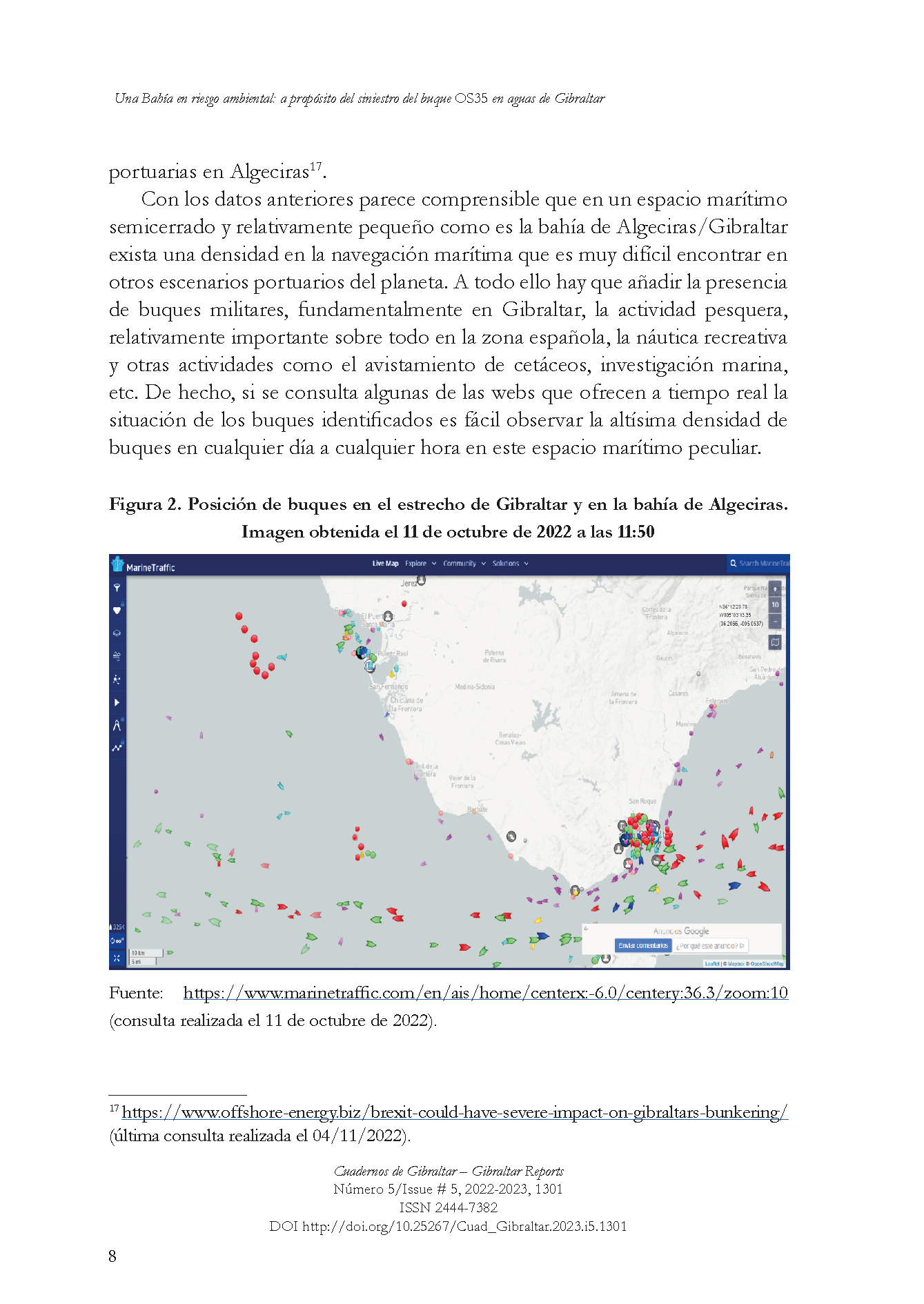 A finales de agosto de 2022 se produjo en aguas cercanas a Gibraltar una colisión y el posterior hundimiento del buque OS35. Todo parecía que podía producirse una gran tragedia ambiental ante la aparatosidad del abordaje, la partición posterior del buque y el rápido y espectacular hundimiento de la proa en aguas cercanas tanto a la costa gibraltareña como a la costa española. Lo cierto es que bahía de Algeciras/Gibraltar presenta una especial singularidad jurídica derivada de las controversias sobre Gibraltar. Además, es un área estratégica con polos portuarios de gran importancia en la navegación intercontinental que se concentran en un área semicerrada. En estas aguas se han venido produciendo un gran número de accidentes de navegación.