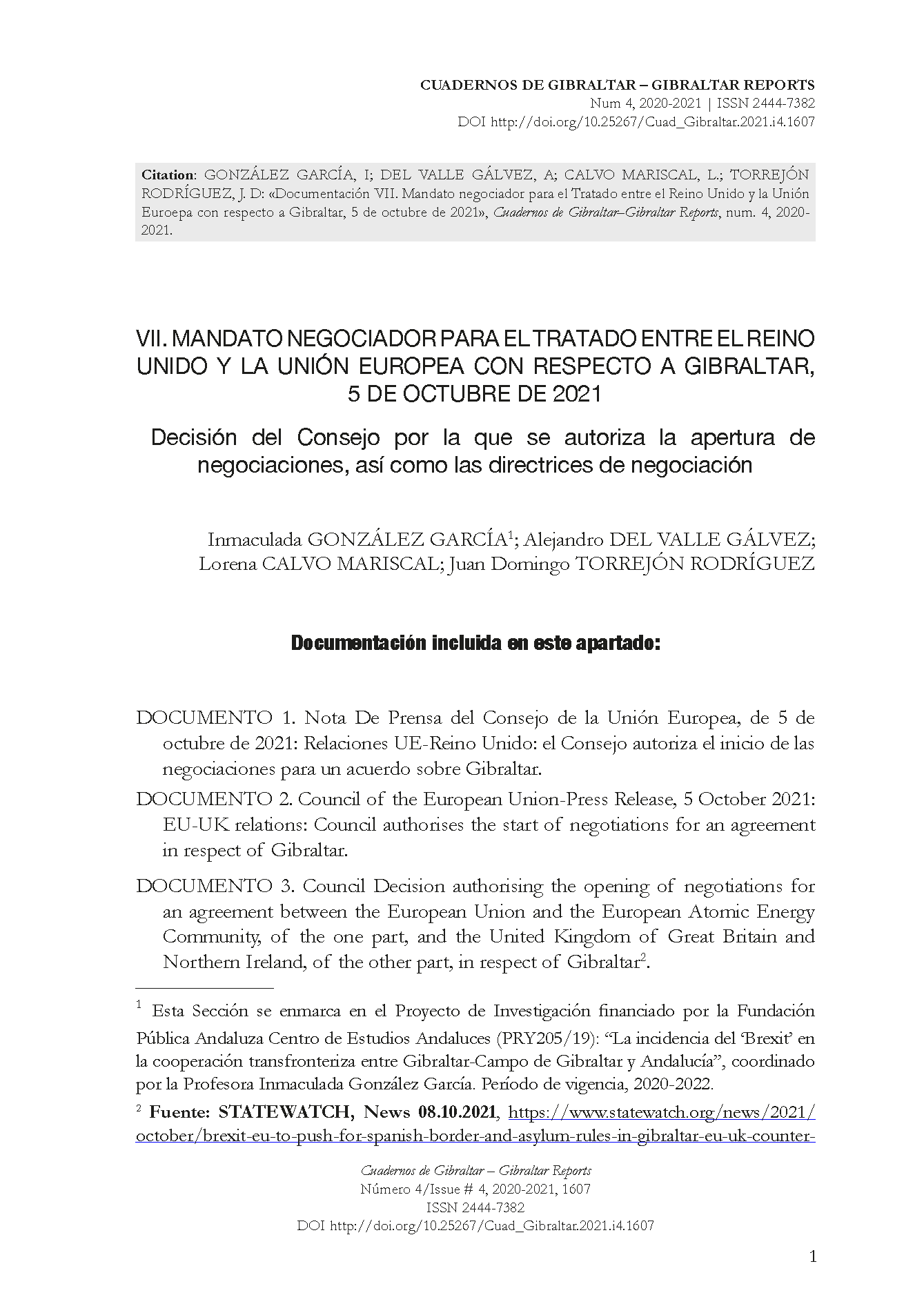 Documentación VII. Mandato negociador para el Tratado entre el Reino Unido y la Unión Euroepa con respecto a Gibraltar, 5 de octubre de 2021