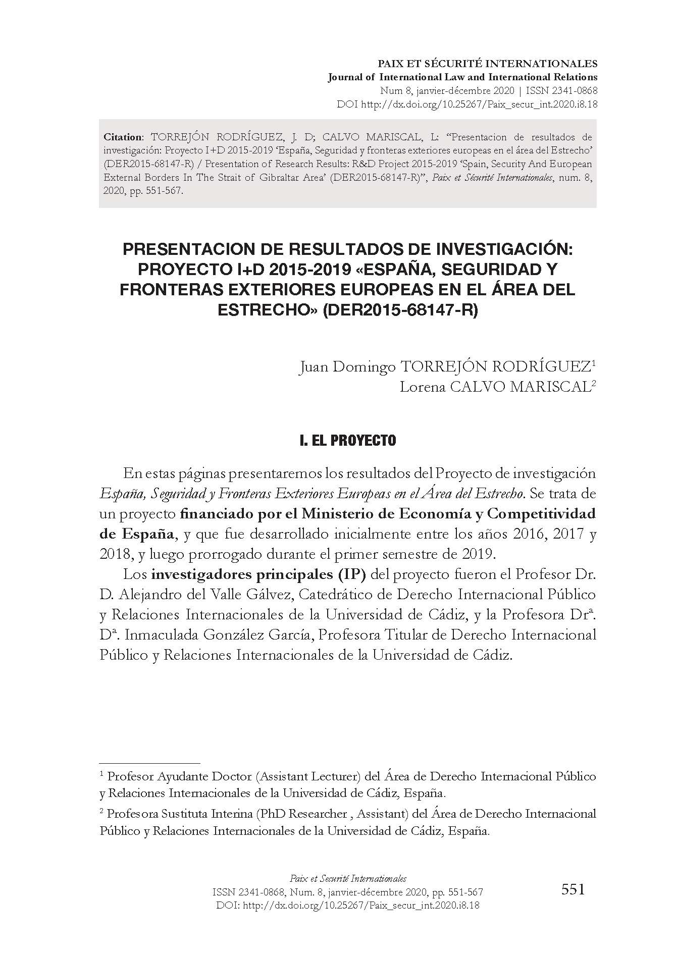 Presentacion de resultados de investigación: Proyecto I+D 2015-2019 ‘España, Seguridad y fronteras exteriores europeas en el área del Estrecho’ (DER2015-68147-R) / Presentation of Research Results: R&D Project 2015-2019 "Spain, Security and European External Borders in the Strait of Gibraltar Area" (DER2015-68147-R)