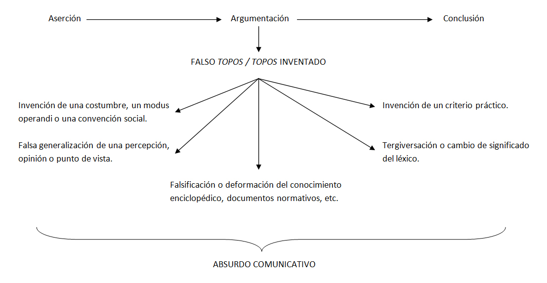 Revisión diacrónica del concepto “garante argumentativo” desde los tópicos aristotélicos hasta la aparición de los términos “topos” (Ducrot), “Ley de pasaje” (Toulmin) y “Preconstruidos sociales” (Grize) en el siglo XX. Análisis del uso inadecuado del topos en relación con la situación comunicativa y de la simulación de un topos irreal como base explicativa del absurdo comunicativo y situacional. Exposición de las cinco situaciones comunicativas absurdas vinculadas con los topoi: invención de una costumbre (modus operandi o convención social), falsa generalización de una percepción (opinión o punto de vista), falsificación o deformación del conocimiento (enciclopédico o de documentos normativos), tergiversación o cambio del significado del léxico e invención de un criterio práctico.